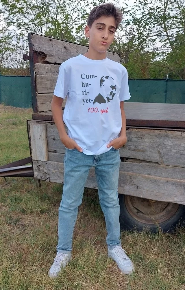 Deritel kalitesiyle hazırlanan bu özel tasarım tişört, Atatürk silüeti ve "Cumhuriyet 100. Yıl" temalı baskısıyla Cumhuriyet coşkusunu stilinize yansıtıyor. Türkiye Cumhuriyeti’nin 100. yılından 200. yılına uzanan vizyonunu simgeleyen bu unisex beyaz tişört, gençler ve genç ruhlular için özenle tasarlanmıştır.